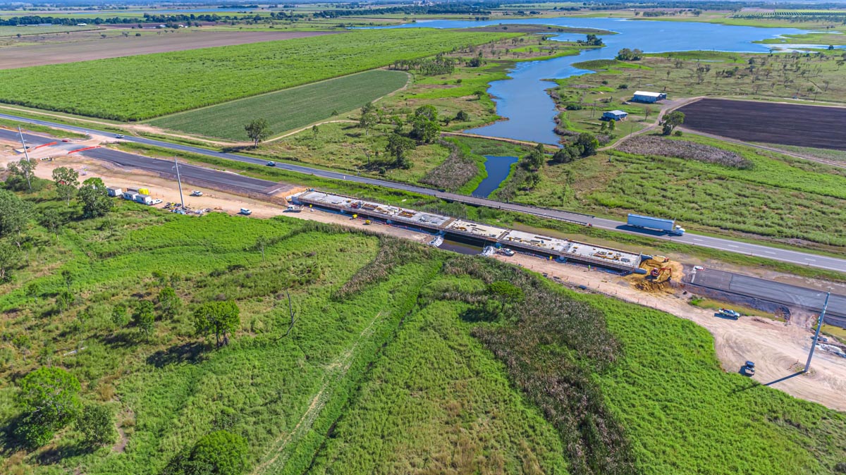 Seven new wider, higher-level bridges (including five waterway bridges and two cane-tramway overpasses over the Hodel Road / Upper Haughton Road cane tram-way and the Shirbourne Road cane-tramway)