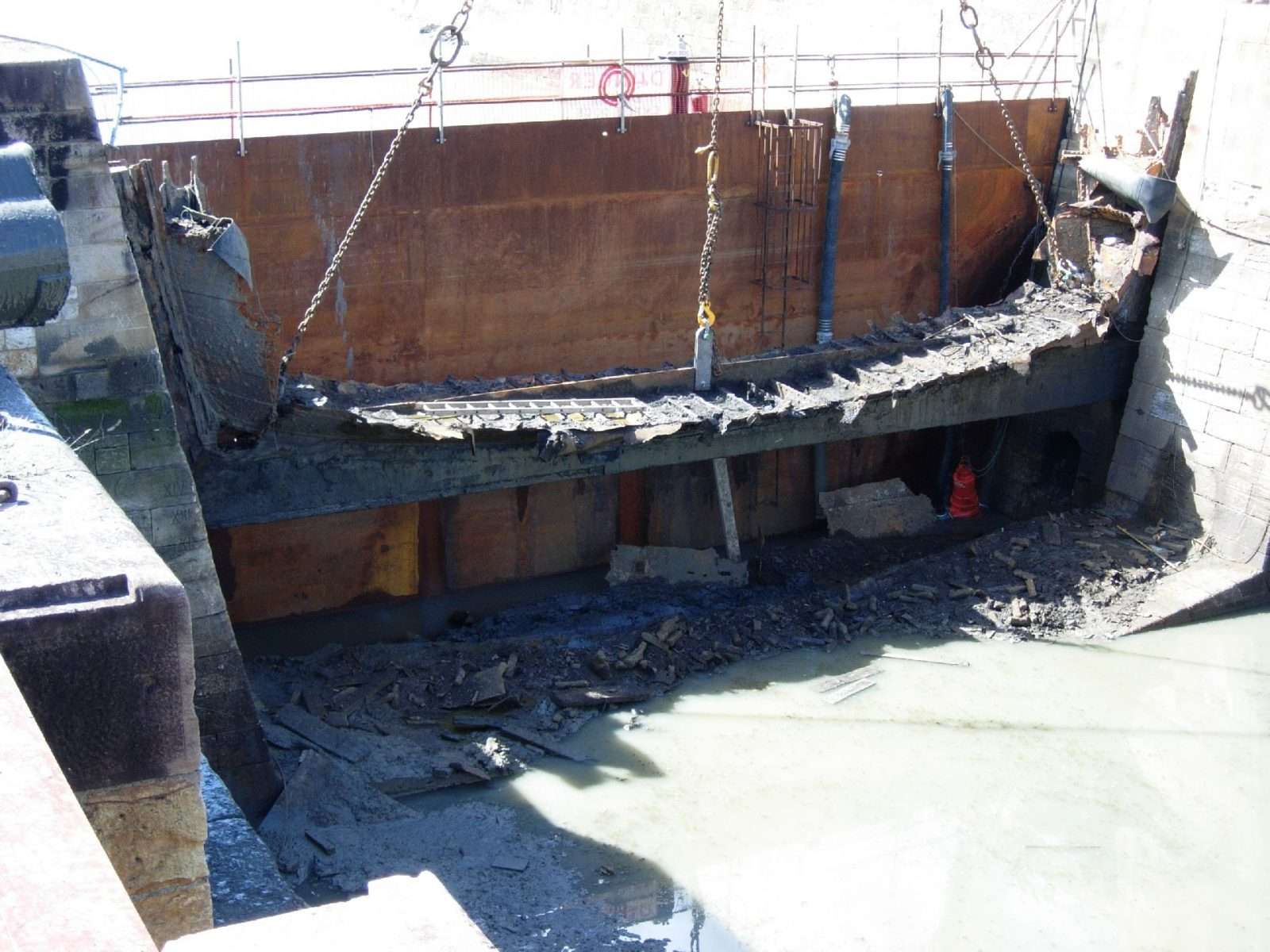 The condition of the existing caisson was worse than originally expected, which required revision of the demolition and construction methodology for the project. Temporary gates were installed on either side to form a cofferdam which enabled demolition to occur in the dry. Localised speed restrictions on the Brisbane River were negotiated to avoid bow wave damage to the temporary gates. The first section of replacement gate was precast on site and lifted in place to avoid durability issues with salt water ingress. The balance of the replacement gate was poured in-situ prior to removal of the temporary gates.