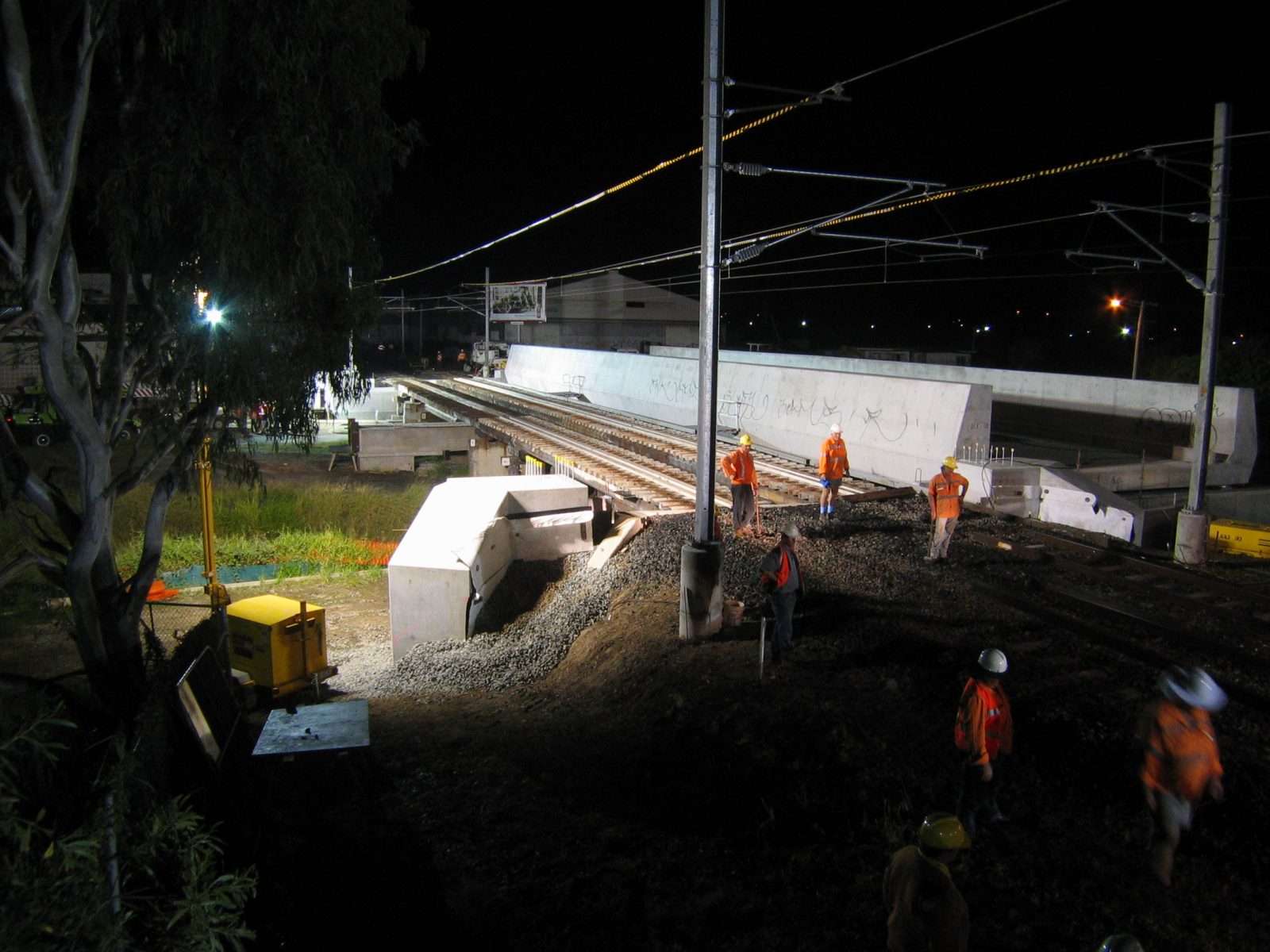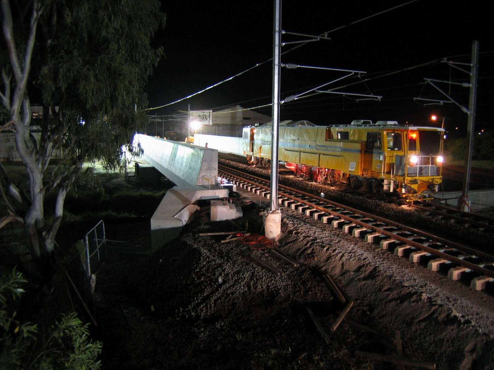 - New bridge constructed adjacent existing timber bridge and pulled into position during long weekend closure of rail line using 2 no 100t stressing jacks. Each span was moved a total of 15m. Bridge spans were supported on pot bearings with a Teflon base that was allowed to slide along stainless steel sliding tracks.