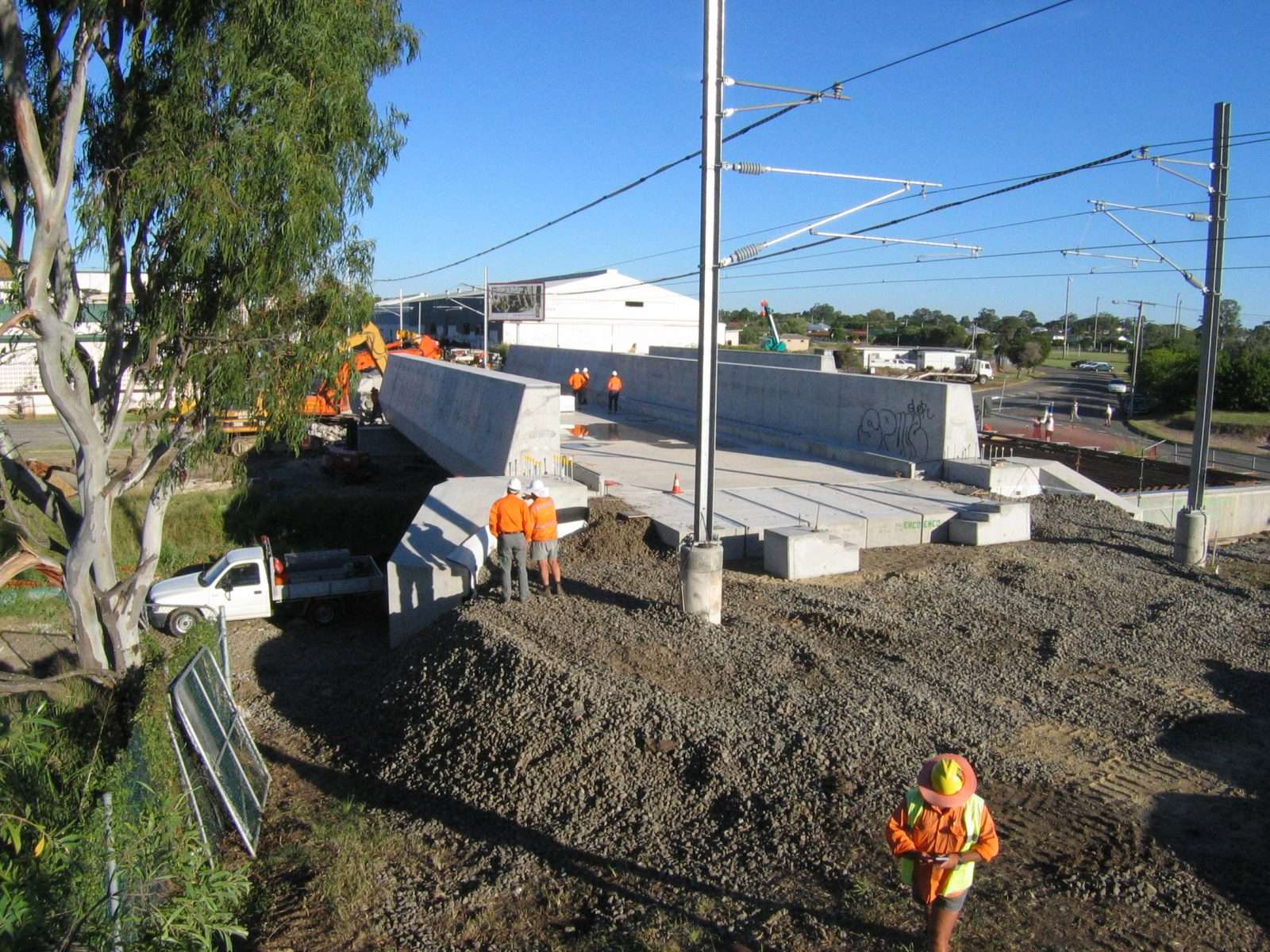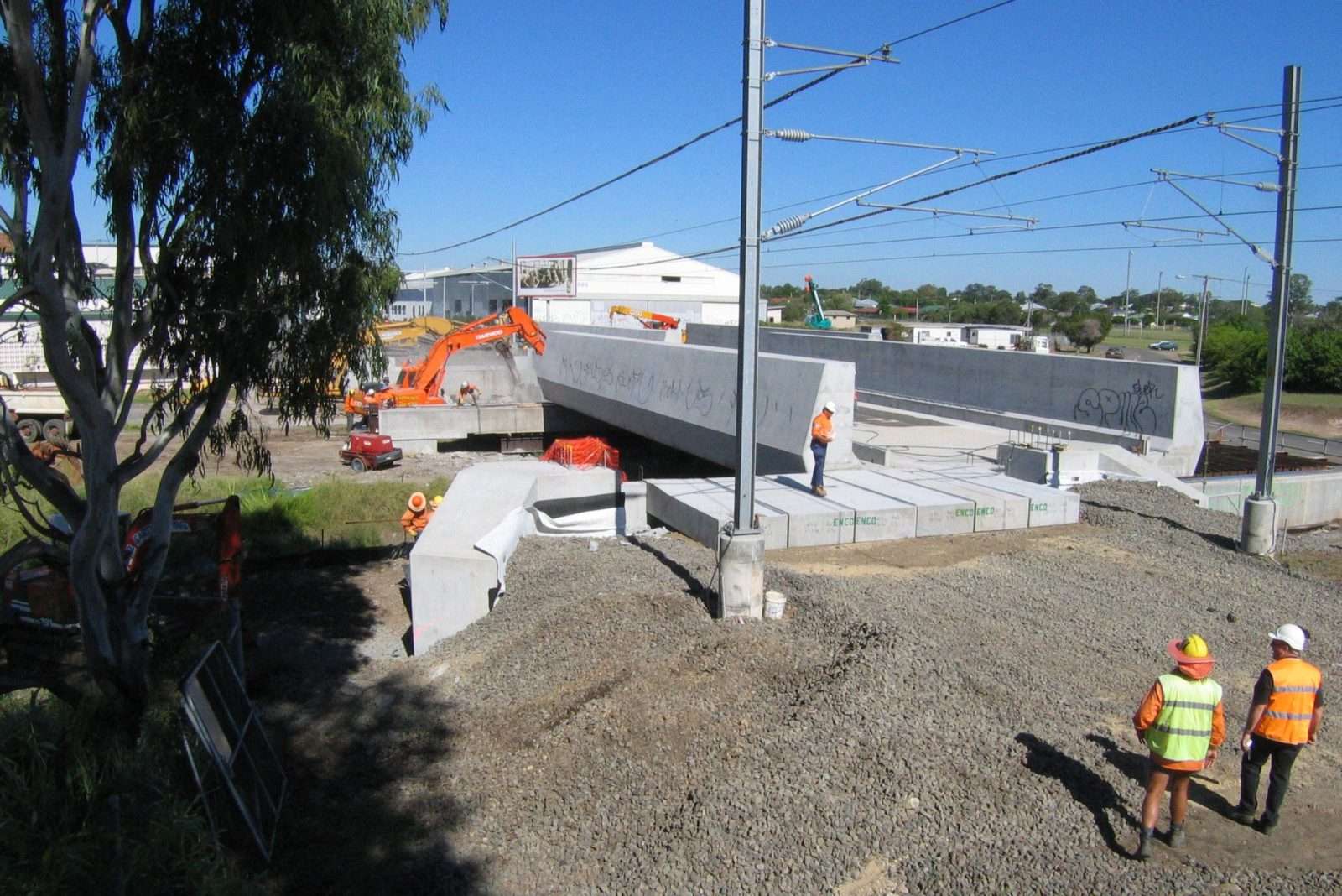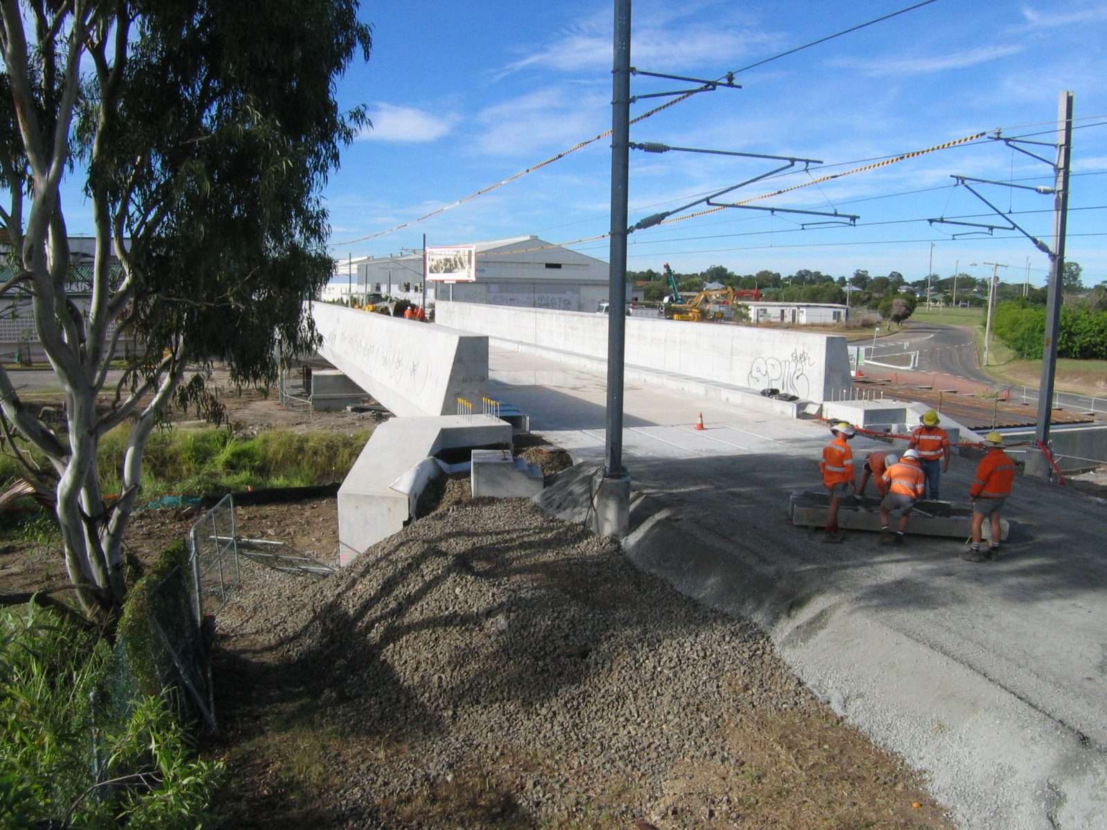 Once the new bridge was completed, the old bridge was demolished and the two new spans were pulled along sliding tracks and into their final position. This was completed over a long weekend with significant co-ordination with Queensland Rail who carried out the earthworks and trackworks to complete the bridge once the bridge spans were in position.